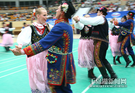 当晚的体育馆灯火辉煌,悠扬的管弦乐回荡在空中,场内,各国舞蹈演员身着形态各异、色彩鲜艳的民族服装在尽情的歌唱、跳舞。婉约的加拿大波士南舞,节奏感极强的南泰舞蹈,还有中世纪复古风情的意大利古旗杂耍让淳安观众领略了五光十色的异域风情。整场精彩的演出在淳安竹马欢腾、跳跃的节奏中圆满结束。