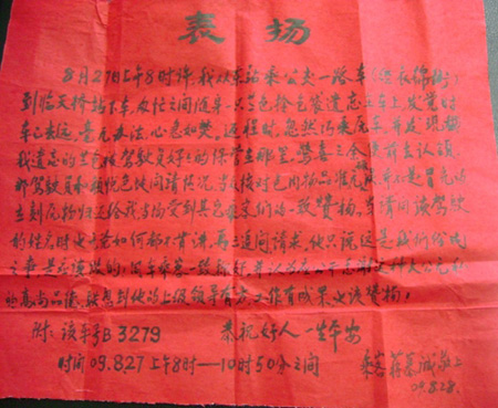 8月27日上午8时许,我从东站乘公交一路车(经衣锦街)到临天桥站下车,匆忙之间随身一只蓝色拎包袋遗忘在车上,发觉时车已去远,毫无办法,心急如焚。返程时,忽然巧乘原车,并发现我遗忘的蓝包被驾驶员好好的保管在那里,惊喜之余便前去认领。那驾驶员和颜悦色地问清情况,当众核对包内物品,准确无误,并不是冒充的,立刻原物返还给我,当场受到其他乘客们的一致表扬。当请问该驾驶员的姓名时,他无论如何都不肯讲,再三追问、请求,他只说这是我们份内之事,是应该做的!同车乘客一致称好,并认为应公开感谢这种大公无私的高尚品德,联想到他的上级领导有方,工作有成果,也该表扬!