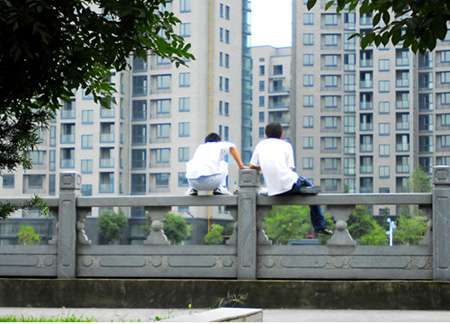 苕溪沿岸景色优美,平时市民都喜欢到河边走走看看,欣赏优美的河景。但图中的小伙子如此动作,既不安全,也和美丽的风景格格不入。