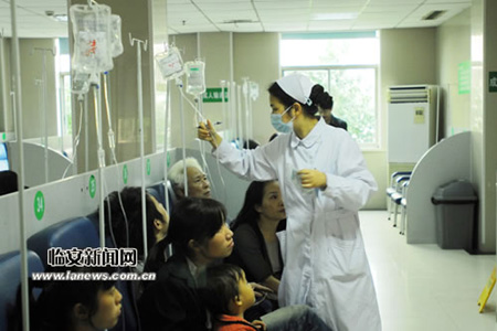 图为医护人员检查输液情况。 陈欣 摄