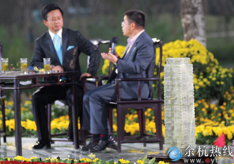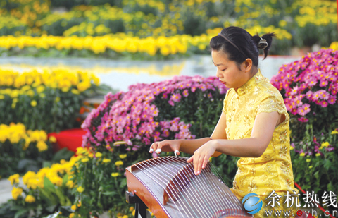 良渚博物院的南门外本是一片临水的草地,工作人员用菊花、老家具等,花了2天的辛苦工作把它变成了典雅的舞台。博物院的南墙被印满赋菊、登高等重阳节诗词的幕布完全覆盖,“满园花菊郁金黄”、“风急天高猿啸哀”、“战地黄花分外香”等诗句扑面而来,气势逼人。