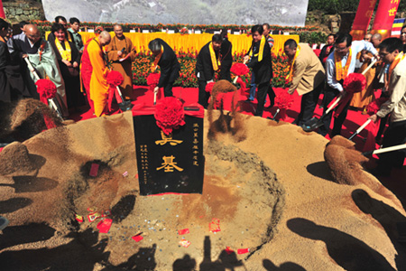 昨日,千年古刹——余杭区径山万寿禅寺复建工程举行了隆重的奠基仪式。市委常委、区委书记朱金坤,浙江省民宗委副主任邢越生,市委统战部常务副部长金志强,余杭区领导姜军、汪宏儿、戚建国、白美玉、王少青、田野,中国佛教协会副会长、浙江省佛教协会会长戒忍大和尚等,以及来自国内佛教界的代表和远道而来的日本东福寺代表出席了奠基仪式。