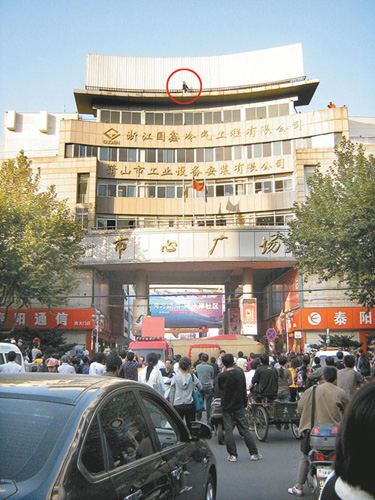 扬言跳楼的男子站在市心广场南大门横梁的左侧,外围没有护栏,只见他非常激动,一边挥舞手一边哭着诉说着什么。