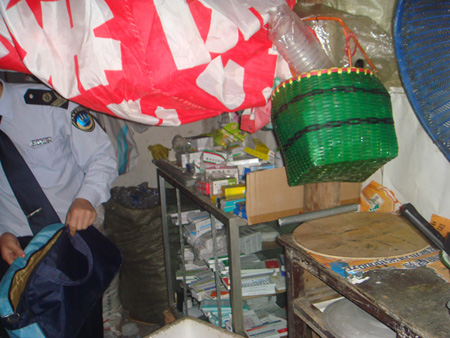 卫生监督人员正在收集祝某的非法行医用具和药品