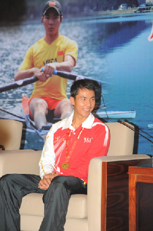 富阳奥运第一人孙杰在第十一届全运会男子赛艇轻量级双人双桨2000米比赛中,拿到富阳有史以来的第一枚全运会金牌,填补了富阳籍运动员夺取全运会金牌的空白,让富阳真正拥有了第一位全运会冠军。昨日,富阳召开座谈会,庆祝孙杰凯旋归来。市领导张锦铭、汤金华、方仁臻等市领导出席。