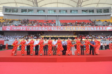 2009年10月30日下午2:30,2009年江干区田径运动会开幕式暨江干区体育场落成典礼在在新建的标准田径场隆重举行。杭州市市体育局副局长季刚、教育局党委副书记应建华应邀出席。区领导徐立毅、蔡仲光、陈震山、郑桂岚、沈 健、刘秋敏、叶小宝、区直机关各单位主要负责人、各街道(镇)主要负责人、各中小学校主要负责人等出席仪式。陈震山致开幕词,裁判员、运动员代表前后宣誓。运动员、表演团队近千人参加了仪式。