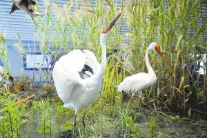 进入展馆前,是一条极富湿地特色的园林景观长廊。除却静静流淌的叠水、悦耳的鸟鸣外,扬子鳄、中华鲟、丹顶鹤和白鳍豚4座湿地野生动物代表的雕塑,成为迎接观众的使者。