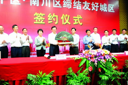 南川区四套班子领导王永康、谭家玲、陈均、祖峰、刘先畅、蒋继华、张祥忠、冯建、夏于峰、简支全、袁志伦和区四套班子领导徐立毅、蔡仲光、朱关泉、蔡建云、陈震山、陈祥兴、周志宏、刘兴仙等出席签约仪式。南川区委书记、人大常委会主任王永康和区委书记徐立毅分别致辞。南川区长谭家玲、区长蔡仲光先后做了各自区情介绍,共同签署了南川区与江干区缔结友好城区协议,出席签约仪式的双方领导以热烈掌声共同见证了这一重要时刻。