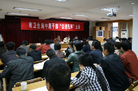 根据市纪委、市监察局的统一部署,昨天下午,市卫生局举行中层干部“公述民评”大会。市纪委、市人大、市政协相关代表,各乡镇(街道)卫生分管领导等百余名民评代表参加。