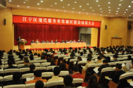 为深入贯彻科学发展观,全面落实全市“服务业优先”战略,抢抓城市化推进机遇,以打造现代服务业集聚区为载体,推进我区现代服务业跨越式发展,加快构筑中心区产业体系,11月12日下午, 区委、区政府召开全区现代服务业集聚区建设动员大会。会议主要任务是:坚持以科学发展观为统领,贯彻落实省委、省政府和市委、市政府关于加快发展现代服务业的战略决策,根据区委八届六次全会的工作部署,动员全区上下进一步统一思想,理清思路,明确目标,落实举措,积极推动现代服务业集聚区建设,加快构筑与中心区相适应的产业体系。为什么要建设现代服务业集聚区?如何建设现代服务业集聚区? 会上,区委书记徐立毅回答了上述两个个问题,强调要坚定信心、创新理念、加强领导、克难攻坚,努力打造现代服务业集聚区,全力推进江干现代服务业跨越式发展。区委副书记、区长蔡仲光主持会议。区四套班子领导邱卫星、蔡建云、陈震山、周金水、郑桂岚、陈祥兴、周志宏、吴巨慧、刘兴仙出席会议。市发改委朱师钧副主任应邀出席会议。
