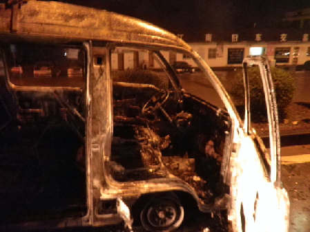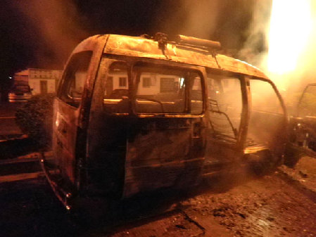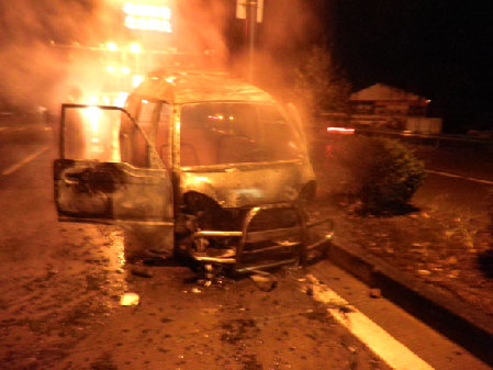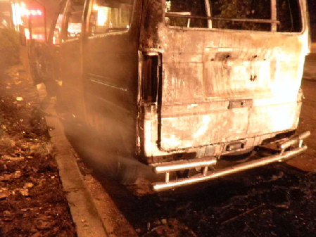 面包车燃烧的火虽然已经被扑灭,但还冒着烟