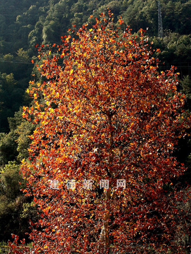初冬的新安江,霜叶正红,映染了江畔两岸的山林,景色美不胜收。此景不禁让人想起杜牧的《山行》:“远上寒山石径斜,白云生处有人家。 停车坐爱枫林晚, 霜叶红于二月花。”