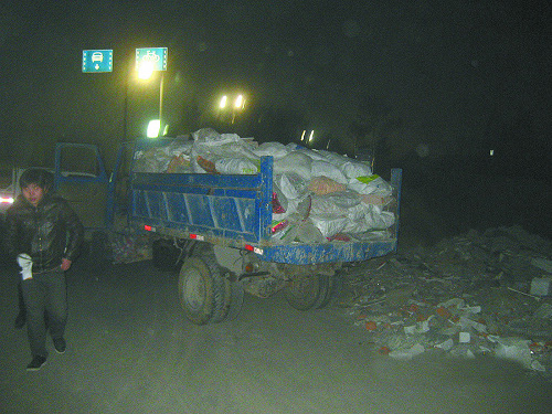 为打击违法倾倒建筑垃圾的行为,3日至7日,每晚6点至第二天早上7点,区城管执法大队北干中队安排戚国锋、谢永建、王挺、罗延华几名队员驾驶没有执法标志的皮卡车在风情大道沿线通宵巡查,间或蹲点监视对面建筑垃圾偷倒点的动静。