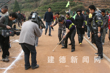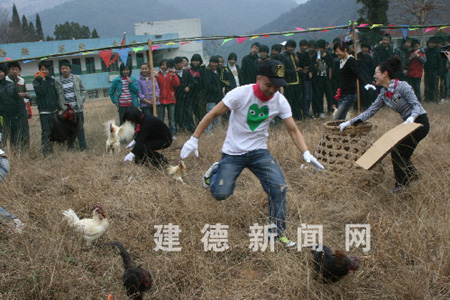 接下去就是精彩的“抓鸡”,10只土鸡放进了围网里,结果抓鸡的人还没进去,鸡就已经开始打架了。这一下可乐坏了杭州来的摄像师。三台摄像机围着打架的鸡拍个不停,总算等鸡分出了胜负,抓鸡的人才开始进去。5个人抓10只鸡,结果人乱扑鸡乱跑,可能是围网小了点的缘故,抓鸡的效率有点高,只用了一分多钟,就完成了任务。而红队总结了绿队的经验,就更加轻松了。有位小伙子每次都抓到两只鸡。一个人就翻倍完成了任务。结果他们以41秒就结束了战斗。另外这里还上演了深山寻宝和莲花镇自编自演的节目,非常精彩。据了解,这台节目将在2010年中旬播出,届时将另行通知,千万不要错过哦。 |