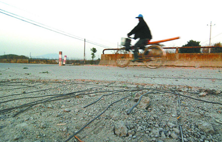 桥面上裸露的钢筋,害不少骑车人遭殃。 读者 董伟 摄