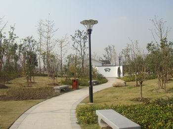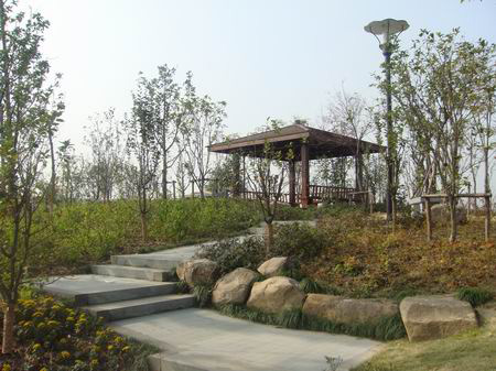 黎明公园座落于笕桥镇黎明村,占地面积9350平方米,工程于2009年2月10日开工。共外运建筑垃圾2150立方米,种植土回填11594立方米;种植香樟、榉树、银杏、桂花等乔木900余株;八仙花、小叶栀子、小丑火棘、络石等灌木地被4800余平方米;草坪2000平方米;各类铺装1459平方米;主入口浮雕景墙47平方米;健身广场塑胶地垫200平方米;单臂及组合廊架各一座;木亭一座;综合管理房1间。
