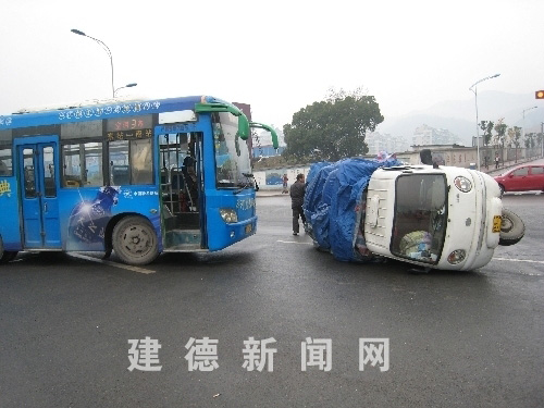 据交警调查,三轮卡是山东牌照,驾驶员夫妇都是桐庐人,他们一早从桐庐赶往大同送货,由于外省牌照,三轮卡不顾前方的红灯继续行驶。不料与对面等候的3路公交车发生碰撞。导致三轮卡侧翻,公交车受损。调查中,交警问三轮卡驾驶员,是不是因为是外省牌照而存有侥幸心理,只要不被抓现行,闯红灯就很难被处罚?面对交警的质问,该驾驶员无言以对,并对自己因违章导致发生车祸也懊悔不已。好在公交车是在停止的状态下,如果是在行驶当中两车迎头相撞,就不仅仅是侧翻这么简单了。