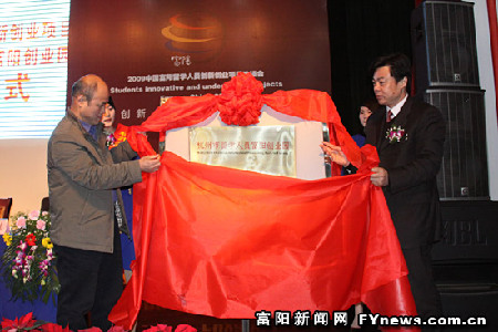 杭州市委人才工作领导小组办公室副主任徐国联(左)与富阳市委组织部部长华德法共同为“杭州市留学人员富阳创业园”揭牌。