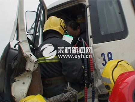 临平消防中队接到报警后,迅速出动消防人员赶赴现场展开救援。消防战士运用液压扩张器,从驾驶室左边将门扩张开,慢慢把方向盘与驾驶员座位之间的距离撑开,腾出空间将驾驶员移出。经过大约20分钟努力,终于将被困司机成功救出,在旁等候的120急救车随即将其送往医院。
