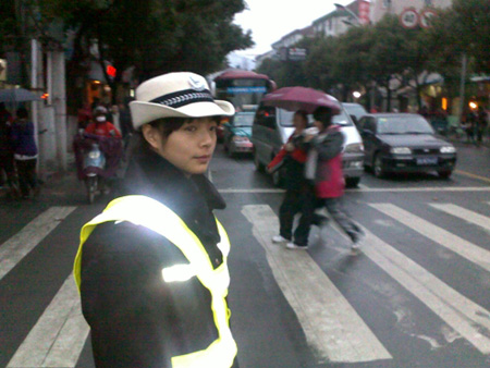 网友“忧愁我的晚风”播报:上下班要路过临天桥,经常看到交警在上下班高峰的时候在那里站岗执勤,挺感谢他们的,天这么冷还站在马路上吹冷风。今天晚上下班回家还看到一个女交警站在临中门口执勤,这么冷的天,还飘着雪花,还真不容易。