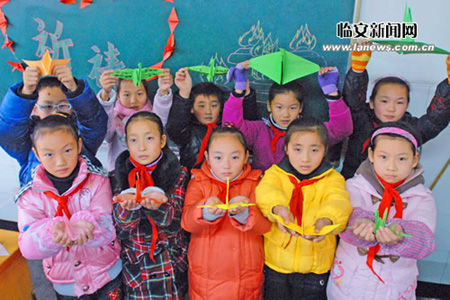 海地地震已经过去十多天了,城南小学的学生们亲手制作千纸鹤,并写上祝福语,默默地为海地地震灾区的小朋友祈福。