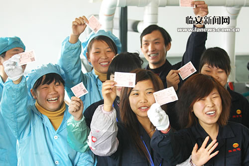 2日起,振有电子有限公司86位外来务工人员将陆续返乡。图为春运前一天顺利拿到回乡火车票的贵州和四川籍务工者。记者金凯华摄