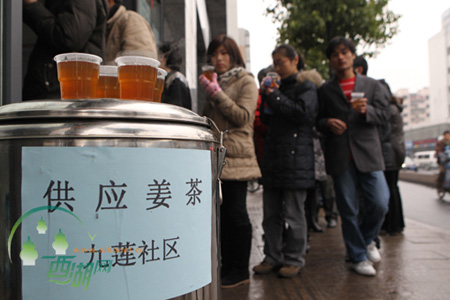 2月2日下午,九莲社区工作人员自行购买生姜5斤、红塘10斤,并联络好一家辖区饭店落实煮姜茶的任务,另备桶装方便面2箱、塑料椅10余张,希望为在寒风中等待买票回家的民工兄弟送上一份温暖。社区主任边把姜茶递给一位衣着单薄的小伙子,一边与其交谈,天冷,你还是应该多穿点;你老家是哪儿的?我家有几位亲戚也是外地的……小伙子乐呵呵地接过姜茶低头喝起来,并时不时抬起头与这位“不相识的大姐”聊天,还回头招呼同来买票的伙伴来喝点姜茶驱寒。