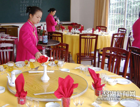 今年以来我县加强各类职业技能培训,其中,餐厅服务员、客房服务员、康乐服务员、营养配餐员等工种培训几乎场场爆满。图为餐厅服务员正在接受技能培训。
