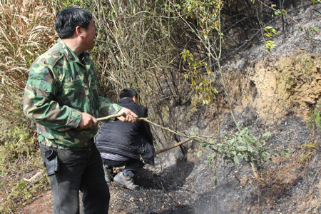 当记者来到三都大桥上就能远远看到山火所引发的浓烟,顺着浓烟的方向,记者赶到事发地三都村樟周自然村。该村村民汪老太介绍说,当天中饭后,她在家里洗衣服,不到下午1时就发现村对面的双溪山上冒烟,仔细一看才知是发生了火灾,随后该村村干部、队组长和党员上山灭火。据汪老太的介绍,最先起火点应该是双溪山脚一座闲置的农房后面山坞中。根据这一线索,记者来到火灾现场并看到,镇村干部和森林防火队员们手持工具正在灭火,由于火线较长,参与灭火的人员被分成6组,在双溪山和火把岭分头灭火或砍隔离带。