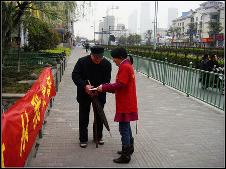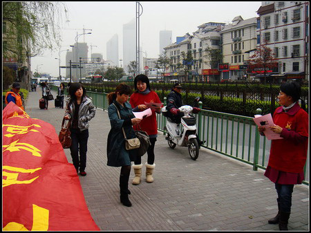 3月22日,新开河边,活动着一帮身穿红色志愿服装的河道文明劝导员,他们不厌其烦地向河道周边的河道中倾倒垃圾、捕鱼、垂钓、沿河护栏杆线上晾晒衣物、破坏河岸绿化等各种不文明行为进行劝导,邀请居民积极地参与到城市河道的管理保护中来。这是江干区城管办河道监管中心借第十八届“世界水日”和第二十三届“中国水周”的契机做的爱河护河、文明劝导的宣传活动。