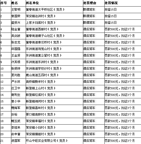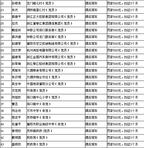 昨日,从市纪委了解到,今年一季度有43名党员、干部因酒后驾车被查处,其中有3人醉酒驾车被拘留15天,40人酒后驾车被罚款500元、扣证3个月。