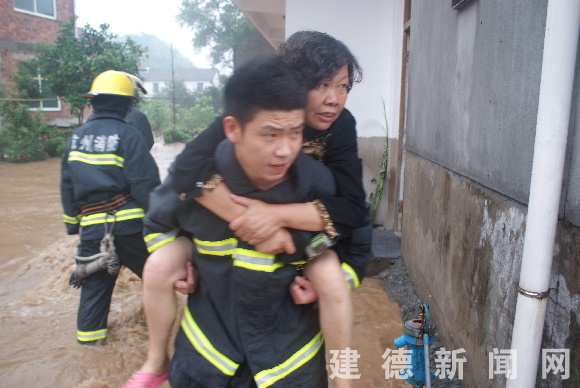6月18日凌晨起至8时,我市西南部寿昌江流域遭遇了十年一遇的特大洪水。6月18日上午7时10分,市消防大队接到110指挥中心指令称:位于大同镇富楼自然村17位村民因暴雨被洪水围困,急需救援。接到报警后,大队立即出动了2辆消防车和14名官兵,带齐水上救援装备赶赴现场进行施救。一个半小时的生命接力,消防战士们与大同镇组成的救援队一道,紧急转移了17位被困村民。