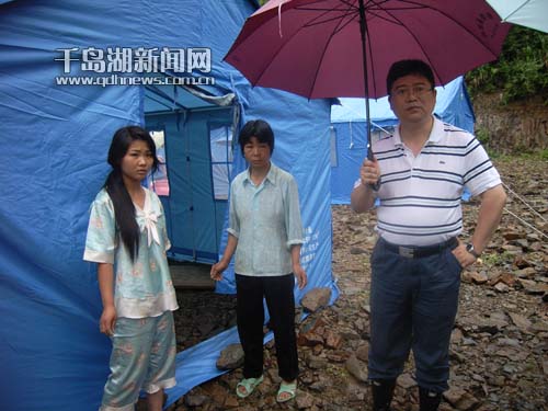 带着一身的泥泞,胡侠来到了村内的集中安置点。看到县委书记来了,受灾的群众纷纷围拢过来,大家像看到久别的亲人一样。尽管生活很艰苦,但大家的精神状态挺好,胡侠和蔼细致地询问说:“生活上还有什么难题,都说出来,我们会想尽一切办法,尽快解决的。”村民们反映说:“现在吃的、用的都基本上满足了,只是帐篷还远远不够,而且没有床。”胡侠一一记下后,立马要求当地政府和民政部门要积极向上争取援助,一方面积极开展自救,把千岛湖镇商店里能买到的折叠床全部买来,先满足群众的需求。并亲切地嘱咐大家,天气热,要注意别中暑。请大家相信党和政府,一定会帮助大家重建家园、恢复生产。