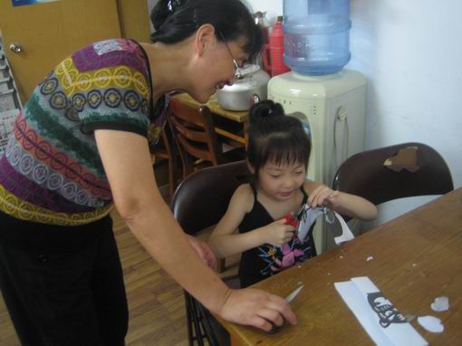 “一听到说要剪出我们的心情时,我就呆住了。平时我只会写,写出自己的心情,现在要剪,怎么办呢?”很多小朋友都紧皱眉头,甚至陪同而来的家长也迷惑不已。不一会儿,整个教室就静得出奇,却听见了剪刀咔嚓咔嚓的声音。孩子们不停舞动的剪刀,就像飞舞的小燕子,一会儿飞到左,一会儿飞到右。用保护世界的奥特曼来表达雄心壮志、用整天爱做梦的猪八戒来表达自己的无忧无虑、用无时无刻不陪伴着懒羊羊的蛋蛋来表达获得友情的渴望……,“心情”,在孩子们稚嫩的手中成了雏形,在志愿者耐心的指导下精心修剪脱颖而出。