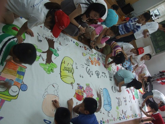 一走进装点一新的社区活动室,彩笔和油画棒所营造出的浓郁的绘画氛围就紧紧地环绕住我们,在80余平米的场地内,一卷长达8米的长轴画卷和一块长约1.6米、宽约5米的画布整齐地铺设在洁净的地板上,上面摆放了各色色彩鲜艳、五彩缤纷的美术用具:有低年级小朋友最喜爱的蜡笔,也有高年级青少年擅长的水彩笔。画布上,浙江工商大学的学生们已为小朋友们打好了轮廓,上面既有可爱的卡通人物如小天使、天线宝宝等,也有风光旖旎的景观建筑、青山绿水、林荫大道,小朋友们在学生志愿者的引导下,纷纷趴在画布上,在自己喜爱的图案上填充自己喜欢的颜色,画得不亦乐乎。而在另一边,中国美术学院的学生们则创造性地将南宋御街的御文化特色融入到绘画创作中,8米的卷轴上,随处可见清幽雅静的石板路、绿树繁茂的中山中路街景,小朋友们除了填色外,还充分发挥各自的想象力,在绿树上勾画出一只生动活泼的小鸟,还形象地描画了自己捡起偶尔在路上看到的一个糖果纸,把它丢进一旁的垃圾箱的环保生活场景。他们时而匍匐、时而卧倒、时而站立,尽管姿态万千,但大家却一点都不觉得累,因为心中怀着同一个梦想“描绘出心中最美丽的杭州,为建设生态、品质杭州出一份力”。