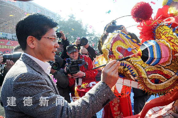 市四套班子领导陈春雷、洪庆华、徐志生、程茂红和建铜集团负责人为参加表演的18条龙点睛。市委书记陈春雷宣布展演正式开始。