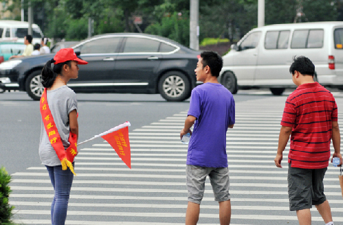 7月18日,区城市管理行政执法局的四名机关工作人员来到江南大道泰安路口开展文明劝导,劝阻行人不闯红灯,劝导行人过马路走斑马线。