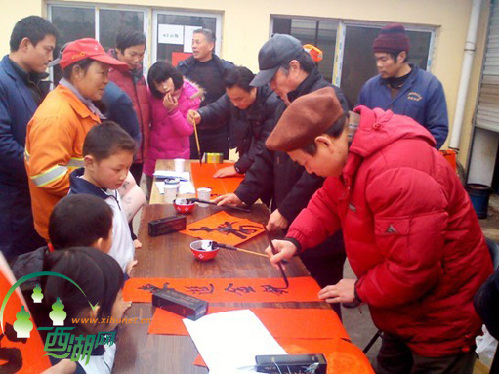 在演出进行的同时,西湖区文化馆书画干部、研究馆员、浙江省书法家协会会员夏有良老师等三位书法家则开始了送春联和送福字的活动。在得知春联和福字是免费的后,现场的居民纷纷开始进行索取,而得到春联和福字的居民们一个个都笑开了花。