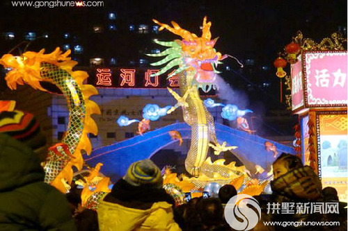 2月5日晚6点30起,运河广场上的彩灯同时点亮,拉开了为期三天的“2012杭城龙年元宵灯会”的大幕,吸引了成千上万的市民走出家门,涌入广场,欢乐赏灯,喜庆元宵。在运河广场的西北角有一面祈愿墙,赏灯的市民可以到工作人员那儿领彩纸,写上对运河申遗的祝愿和祝福,并贴上祈愿墙,为大运河申遗助威。而绕到广场牌楼的西面,是群众自制的花灯以及民间彩灯展示区,足足有100多只。大关街道各社区制作的花灯也在此处悬挂,色彩缤纷,令人眼花缭乱。 元宵赏灯,让居民更好地体会传统春节的意义。
