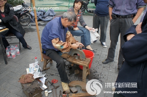 每隔一段时间,冯师傅就会在社区里支起他的小摊位,一条宽板凳,上面一块大大的磨刀石,边上一个大水桶。磨剪刀、炝菜刀的工具,一样都不少。每到这个时候,就会有居民把自个家里钝的剪刀、菜刀拿来给冯师傅。冯师傅很认真,每一把剪刀、菜刀都会仔仔细细地磨了又磨,直到磨得锋利无比、雪亮照人。记者计算了下,磨一把剪刀平均要花5分钟,炝一把菜刀平均要花10分钟。前来磨刀的社区居民都说冯师傅磨剪刀炝菜刀技艺精湛,牢靠的很。这种杭城老行当,现在几乎见不到了。记者了解到,现在别的地方磨剪刀、炝菜刀都用电动机了,只有冯师傅这里才能看到纯手工的磨剪刀、炝菜刀了。一说起他磨刀子的工具,冯师傅显得有些自豪。他说:“我原来那套现在放在手工艺活态馆里,这套是他们为要我那套旧的专门做的,用新的跟我换的。” 请冯师傅帮忙磨过刀的周先生感慨道:“现在很少能看到手工磨剪刀了,特别怀念小时候老巷子里传来‘磨剪刀嘞’的吆喝声。”