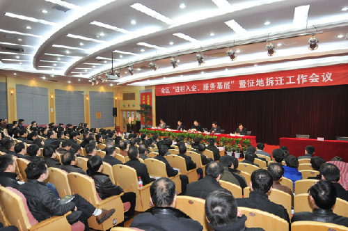 为深化创先争优活动,进一步加强机关作风建设,全力破解经济社会发展中的重点和难点问题,3月2日下午,高新区(滨江)召开“进村入企、服务基层”暨征地拆迁工作会议。张耕、詹敏、韩建中、沈孔良等区四套班子领导出席会议并在主席台就座。区党委书记张耕作重要讲话,区党委副书记、管委会主任、区长詹敏作报告,区委副书记俞少平主持会议。