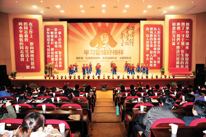 在主题报告会上,县委常委、宣传部长王优健指出,“弘扬雷锋精神、彰显道德风尚”活动的举行,最终目的是要最大程度的团结广大干部、群众,凝聚人心,积极进取,为打造“五大桐庐”提供精神动力。王优健强调,学雷锋就要学他的精神,把有限的生命投入到无限的为人民群众服务中去,服务人民,助人为乐的奉献精神;干一行,爱一行,钻一行,精一行的敬业精神;锐意进取,自强不息的创新精神;艰苦奋斗,勤俭节约的创业精神。同时,学雷锋精神也要与时俱进,新的时代、新的时期,雷锋精神也要有新的发展,新时期的学雷锋不仅是时代发展的必然要求,更是人民群众的强烈呼唤。此外,学雷锋更要常态化,立足实际,与县委县政府打造“五大桐庐”相结合,解放思想、转变作风,为实现桐庐跨越发展,打造中国最美山水型现代化中等城市提供强大的道德支撑和精神动力。