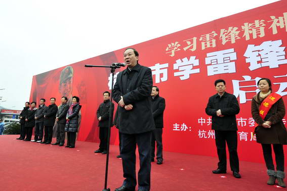 绵绵春雨挡不住“学雷锋”热情。在纪念毛泽东同志题词向雷锋同志学习49周年来临之际,3月4日上午,由市委宣传部、市文明办和西湖区区委区政府等单位主办的杭州市学雷锋为民服务日活动启动仪式在西湖区黄龙体育中心广场举行。省委常委、市委书记黄坤明宣布仪式正式启动并接受媒体采访。市委副书记王金财讲话。市委常委、秘书长许勤华,市委常委、宣传部长翁卫军,副市长陈小平,市政协副主席郁嘉玲,区委书记、区人大常委会主任王立华,区委副书记、区长朱党其,区领导赵忠伟等出席。