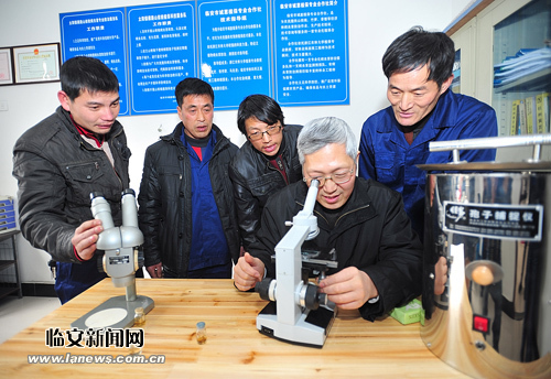 浙江农林大学教授指导农户通过显微镜观察山核桃病虫害。