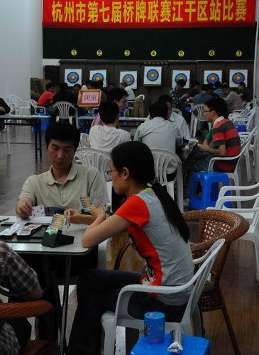 26日,由市体总、市桥牌协会主办,江干区体育局、区体总承办的杭州市第七届桥牌联赛江干区站(第2站)比赛在江干区体育中心射箭馆如期开站,来自全市28支代表队伍160多名牌手参加了比赛。