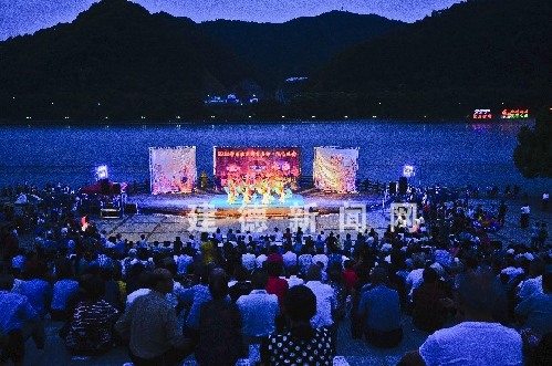 晚会,在一曲《花头台》器乐合奏的音乐声中拉开序幕,数百名观众一边领略新安江奇雾、享受阵阵从新安江上而来的爽人凉风,一面观看百姓大舞台上由建德市婺剧演员表演的精彩节目。整个晚会精彩纷呈,有器乐合奏、戏曲舞蹈、小品、笛子独奏、群舞和独唱等,其中气势挥弘的戏曲舞蹈《百万雄狮过大江》把晚会推上高潮。